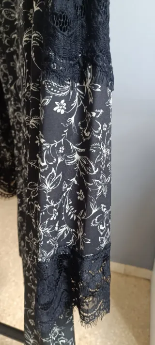 Vestido de manga larga con un bonito estampado floral en blanco sobre fondo negro. Presenta detalles de encaje en los puños. - Diseño con estampado de flores. - Mangas largas con encaje.