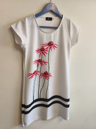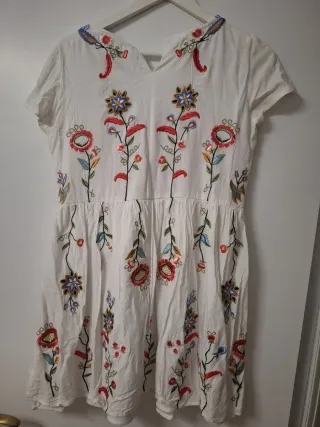 Vestido blanco con un bonito estampado floral bordado. - Diseño de manga corta. - Falda con vuelo. - Bordados de flores y hojas en varios colores.