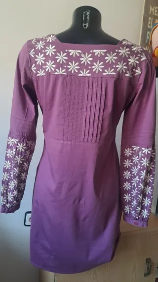 Precioso vestido con un diseño floral bordado. - Bordado floral en el cuello y mangas. - Detalle de pliegues en la parte delantera. - Mangas largas. - lleva un cinturón a juego bordado. Medidas sisa 46 cm cintura 43 cm largo 89 cm.