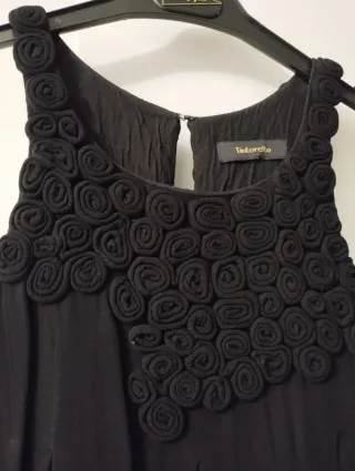 Elegante vestido negro de la marca Tintoretto. Presenta un diseño único con aplicaciones de flores en relieve alrededor del cuello y los hombros. - Detalle de flores en relieve. - Cierre en la espalda.