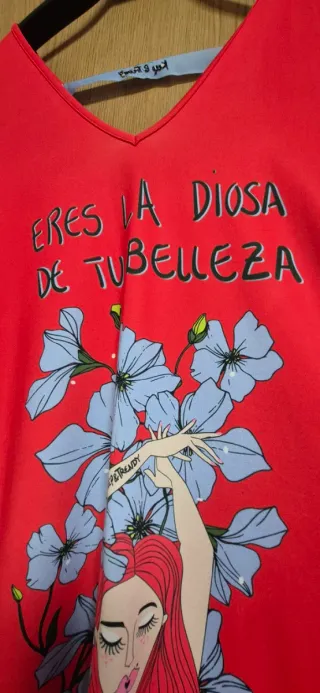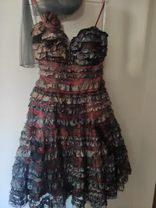 Vestido de ceremonia usado una vez, talla S, puede ponerse como palabra de honor o con los tirantes rojos, entallado de cuerpo superior y falda de vuelo, la falda lleva tul para dar volumen. Lleva broche en flor que se puede quitar y un fular a juego.