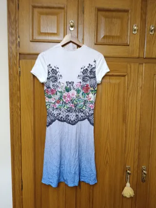 Vestido tipo peto con un alegre estampado de flores. Talla S. Nunca puesto - Diseño con tirantes ajustables. - Bolsillo frontal. - Estampado floral sobre fondo azul.