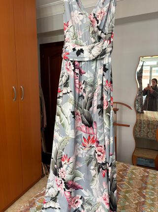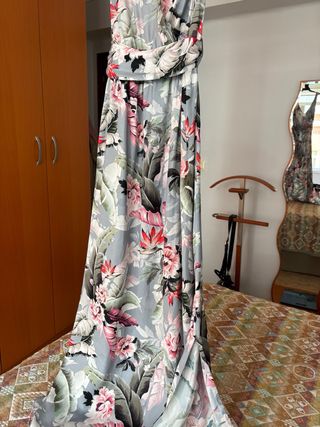 Vestido de fiesta con un diseño floral único. - Tirantes finos. - Lazada decorativa en la cintura. - Estampado de flores en contras