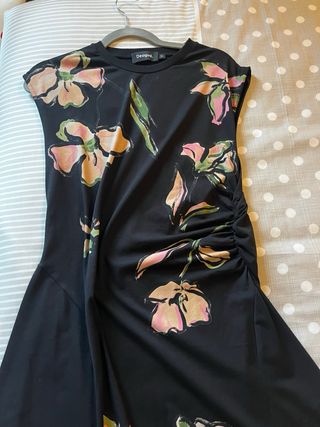 Vestido largo de la marca Desigual con un estampado floral vibrante sobre fondo negro. Presenta un detalle fruncido en un lateral que añade un toque moderno. - Diseño de manga corta. - Corte asimétrico en la falda. - Estampado de flores en tonos rosas y melocotón.