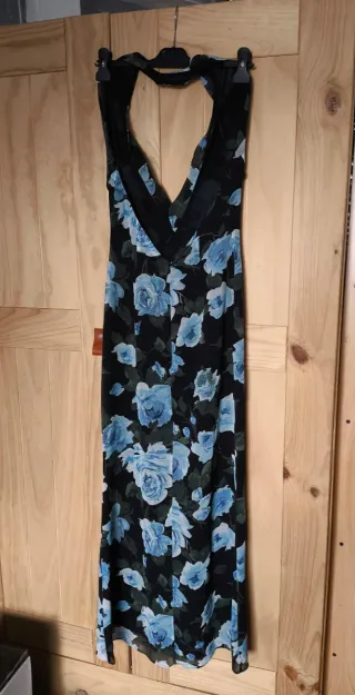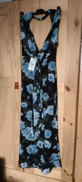 Vestido largo de Zara con estampado flora negro y tonos azul. Es una prenda nueva con etiquetas. - Diseño con escote pronunciado. - Detalle de nudo desde escote. - Tejido ligero y fluido.