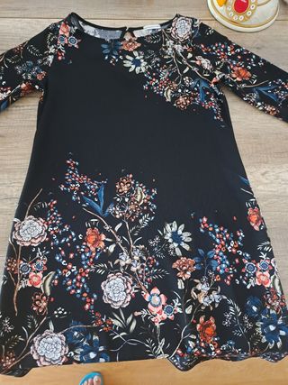 Precioso vestido de flores, ideal para cualquier ocasión. ✨ - Diseño de manga larga. - Cuello redondo. - Estampado floral multicolor sobre fondo negro. - Corte a la altura de la rodilla. - Tejido ligero y fluido.