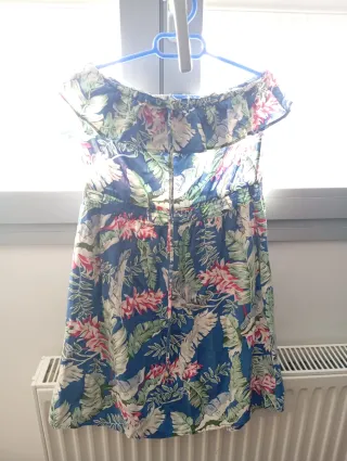Vestido ligero con estampado floral, ideal para días cálidos. - Diseño con volantes en el escote. - Cintura elástica para un ajuste cómodo. - Estampado tropical con hojas y flores. Muy poco uso.