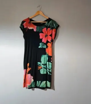 Vestido de manga corta con un llamativo estampado de flores tropicales sobre fondo negro. - Diseño con flores en tonos rojos, naranjas y verdes. - Corte recto y cómodo. - Ideal para un look casual y vibrante. Perfecto Estado PRECIO NO NEGOCIABLE Hablar conmigo antes de comprar
