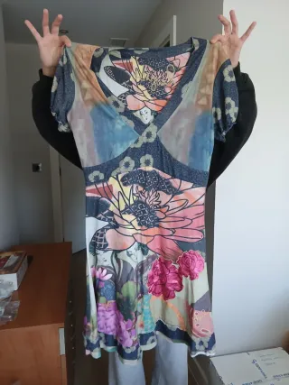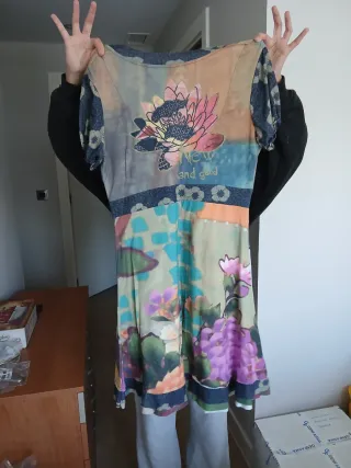 Vestido de la marca Desigual con un estampado vibrante y colorido. - Talla XL. - Diseño con flores y motivos abstractos. - Manga corta.