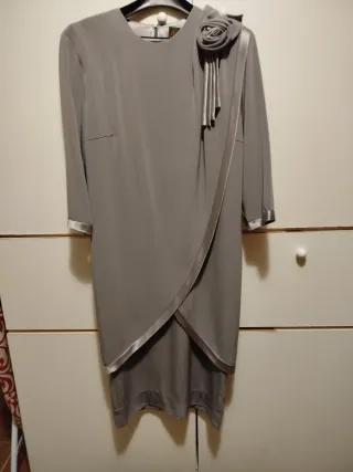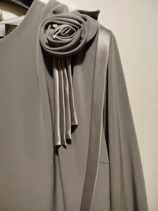 Elegante vestido de fiesta, ceremonia en tono gris, perfecto para eventos especiales. Destaca por su delicado detalle floral en el hombro y un drapeado sutil. Raso invertido - Diseño con flor ornamental. - Drapeado en cascada. - Tejido con caída.