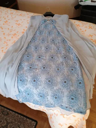Elegante vestido de fiesta con un diseño de dos piezas. - Cuerpo superior adornado con flores. - Falda larga y vaporosa en tul azul. Se vende vestido utilizando solo una vez en el bautizo de mi hijo. Lo vendo por porque me está grande. Sirve para una talla M/ L. Se prueba en Alcalá de Henares. Lo vendo a mitad de precio.