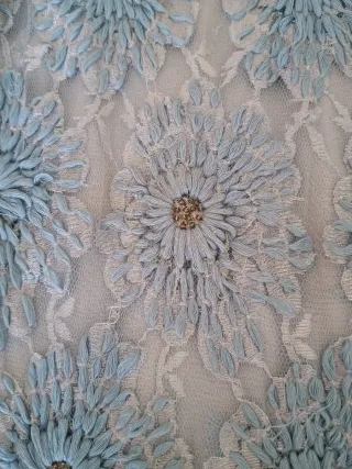 Elegante vestido de Javier Simorra con capa incorporada. El diseño presenta un delicado encaje con flores bordadas en tonos azules. - Detalle de flores bordadas en todo el vestido. - Capa fluida que añade un toque de sofisticación. - Cierre en la parte superior del cuello.