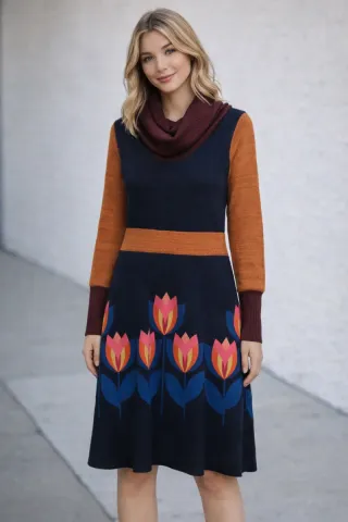 Vestido de invierno con un diseño floral llamativo. - Mangas largas en tono naranja quemado. - Cuerpo superior en azul marino. - Detalle de cuello alto acanalado en burdeos. - Falda con estampado de tulipanes en azul, naranja y rosa.