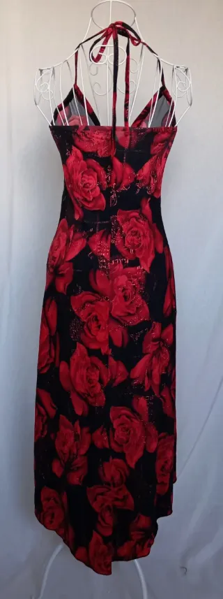 Vestido de fiesta con un diseño asimétrico y estampado de flores rojas sobre fondo negro. - Escote en V - Atado al cuello - Espalda descubierta - Tejido ligero con caída - Detalle de tirantes finos.