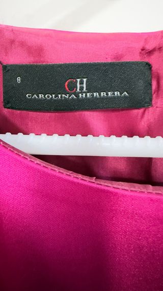 Elegante vestido de fiesta de Carolina Herrera. - Diseño sin mangas. - Cinturón con detalle de flores. - Tejido satinado en tono fucsia.