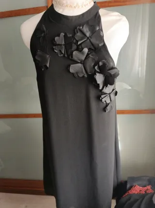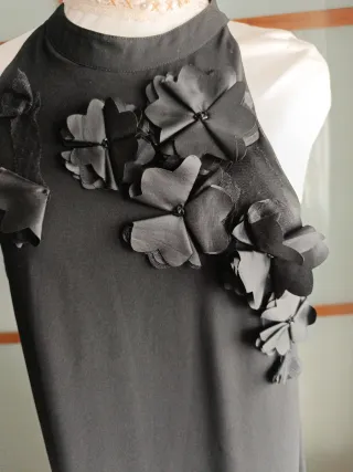 Elegante vestido negro con un diseño de flores decorativas en el corpiño. - Escote halter. - Flores aplicadas en relieve. - Diseño de corte recto.