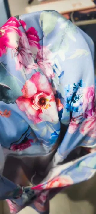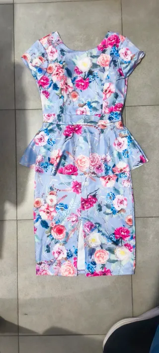 Vestido con un estampado vibrante de flores en tonos azules y multicolores. Presenta un diseño elegante con peplum en la cintura y una abertura sutil en la falda. - Diseño de manga corta - Corte midi - Estampado floral llamativo - Lleva colcha incorporado por lo cual no es necesario sujetador Solo usado 1 vez