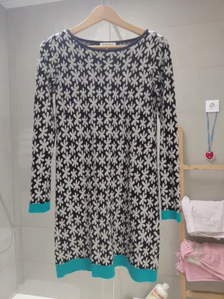 Vestido de punto de la marca SUNDARA, puesto una sola vez. - Diseño con estampado de flores blancas sobre fondo negro. - Puños y bajo en color turquesa. - Talla xs.peto da para una 36.