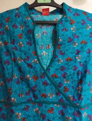 Vestido de la marca Lingam con un estampado vibrante de flores sobre un fondo turquesa. Su diseño cruzado y sin mangas lo hace ideal para climas cálidos. - Diseño cruzado en el escote. - Cintura marcada con detalle. - Estampado floral multicolor. - Talla XL Entrega en manos en Barcelona.