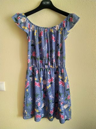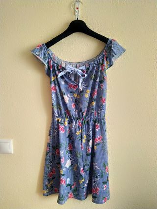 Vestido mini de verano, marca Springfield, estampado de flores sobre fondo de líneas verticales en azul y blanco. Cuello redondo. Se puede llevar sobre o bajo el hombro. Atado en la espalda con lazo azul. Entallado con banda elástica en la cintura. Fresco y cómodo.