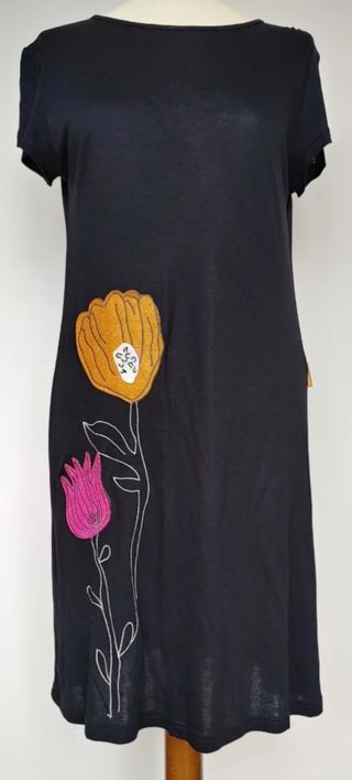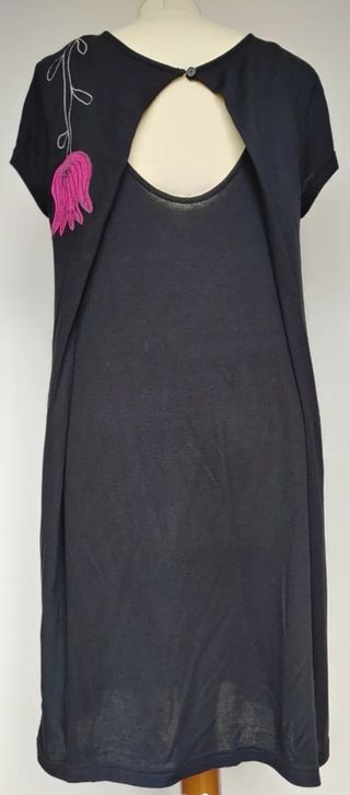 Precioso vestido de la marca Desigual. Poco uso; muy buena estado. - Diseño con estampado floral blanco y detalles ornamentales. - Cuello redondo.(el logo de Desigual con flor azul es interior.) - Manga corta.