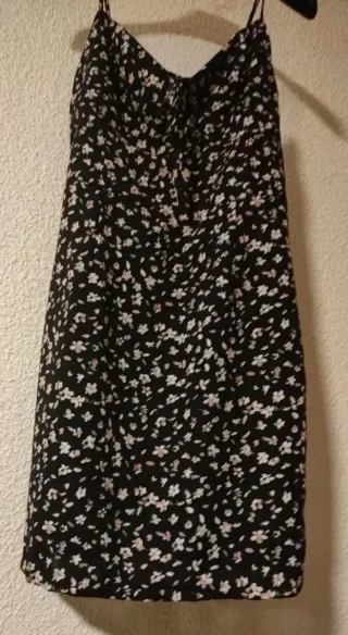 Precioso vestido con estampado floral sobre fondo negro! Es una prenda súper ligera, cómoda y con un toque muy femenino gracias al detalle del lazo en el escote. Ideal para un paseo veraniego, una cita o una tarde con amigas. Detalles del vestido: Estampado: Pequeñas flores en tonos rosas, blancos y azules que resaltan muchísimo. Corte: Escote en "V" con un pequeño cordón en el pecho para adaptarlo a tu gusto. Tirantes: Finos (tipo espagueti), perfectos para los días de calor. Estado: En excelente estado, muy poco uso y la tela se siente súper fresca.