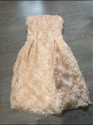 Vestido de fiesta sin tirantes con un delicado diseño floral. - Diseño con textura de rosas. - Corte favorecedor. - Ideal para eventos especiales.