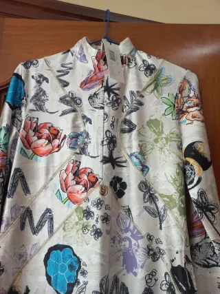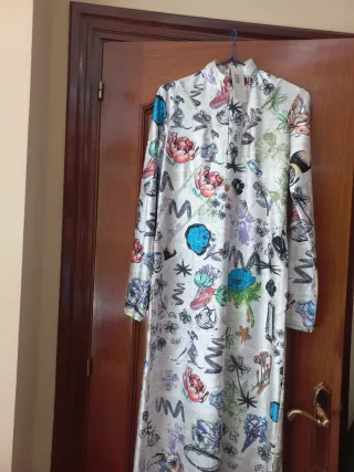 Vestido largo con un diseño llamativo y original. - Estampado de flores y elementos abstractos. - Cuello alto. - Manga larga.