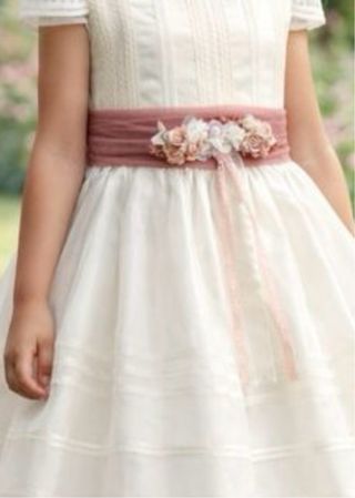 Elegante vestido de comunión, perfecto para una ocasión especial. - Diseño en color blanco. - Cinturón decorativo con flores en tonos verdes. - Mangas cortas con detalles de encaje. - Falda larga y vaporosa con puntilla en el bajo.