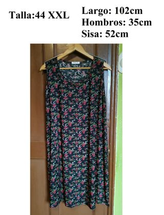 Vestido negro con un estampado de flores rojas y blancas. Vestido largo, sin mangas con tirantes. Talla 44 - XXL Largo: 102cm Hombros: 35cm Sisa: 52cm - Composición: 95% poliéster, 5% algodón. MEDIDAS Largo: 102cm Hombros: 35cm Sisa: 52cm