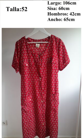 Vestido camisero de manga corta con un alegre estampado floral sobre fondo rojo. Presenta cuello camisero y cierre de botones en la parte delantera. Incluye dos bolsillos en la parte delantera y cinturón. Talla: 52 - Largo: 106cm - Sisa: 60cm - Hombros: 42cm - Ancho: 65cm Fabricado en España 100% poliester