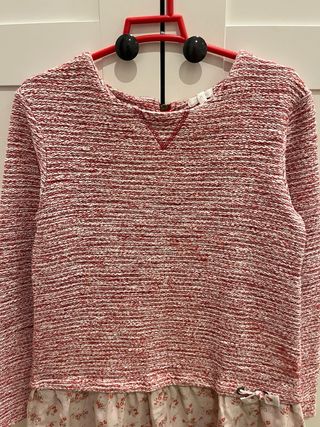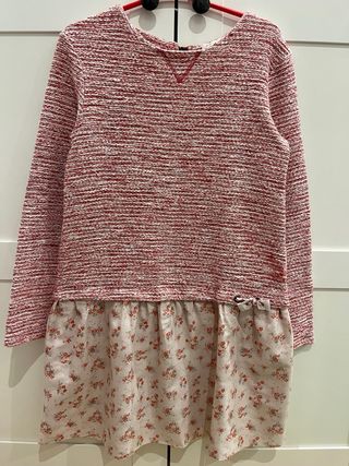 Original vestido BASS 10 para niña/mujer. Vestido de manga larga de una sola pieza pero tiene dos partes bien diferenciadas. La parte superior de manga larga color rojizo jaspeado es de textil tipo jersey y la parte inferior es de tela ligera con estampado floreado muy bonito. Cierre trasero con cremallera. Talla 16 ( Largo 85cm aproximadamente) Usado en una ceremonia en una ocasión. En perfecto estado. Descuento a partir del segundo artículo