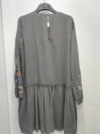 Vestido gris de Zara con un bonito bordado floral. Talla L - Mangas largas. - Detalle de volantes en la parte inferior. - Bordados de flores multicolores en el pecho y mangas.