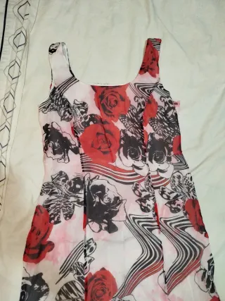 Precioso vestido de la marca Desigual, aparentemente en buen estado. Aunque la etiqueta indica talla 46, se ajusta más a una 40/42. - Diseño estampado con flores y detalles decorativos. - Sin mangas. - Cierre de cremallera en la espalda.