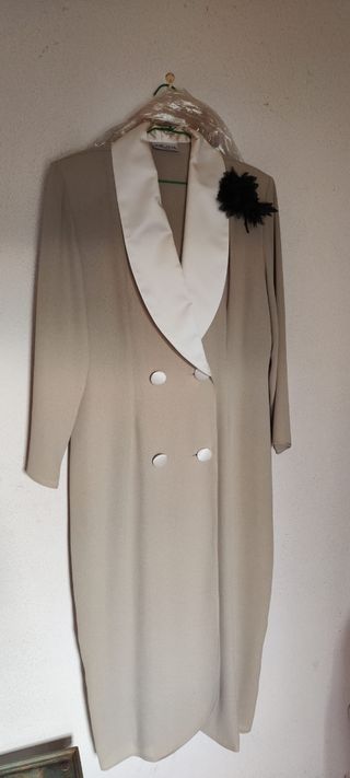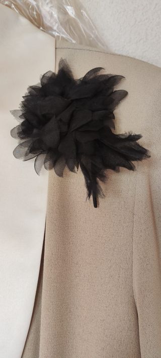 Vestido elegante para señora, en colores neutros, de la marca SHELANA LONDON para EL CORTE INGLÉS. Medidas: LARGO: 125cm aprox. ESPALDA (de hombro a hombro): 44cm aprox. CINTURA: 85cm aprox. Cuello smoking con pequeño botón escondido detrás solapa para que quede cerrado. Y 4 botones forrados delanteros para cerrar el vestido. Con flor tela negra en solapa para dar un toque más al vestido. Viste elegante y cómoda para esa ocasión especial. Todo lo recaudado irá donado íntegramente a la protectora de animales Bihotzetik Elkartea.