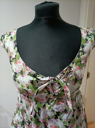 Se vende Vestido de verano de Zara. Tonos negro con flores blancas y verdes. Talla S, Marca Zara. Detalle de lazo en pecho y bolsillos laterales. Forro interior en negro.