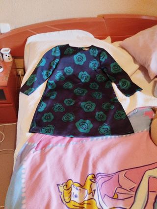 Fondo crudo, flores marrón oscuro, casi negras. Cuello y mangas doradas. No se arruga. Largo aprox 116 cm. Dos cortes en los laterales. Corte en forma de A.