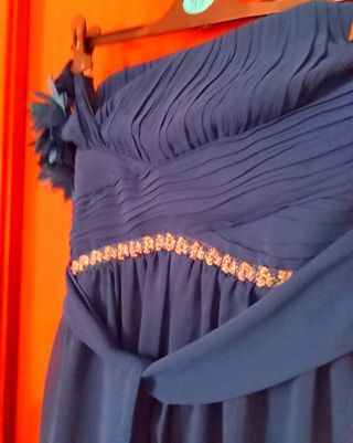 Vestido invitada para eventos color azul con detalle dorado y flor en un lado ,largo ,estilo palabra de honor ,puesto una vez,la talla da para una M tranquilamente