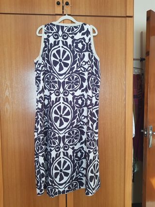 Vestido sin mangas, talla S, marca Desigual. El escote es en forma V y por la parte trasera puedes hacer una lazada con las cintas que lleva en los laterales, color blanco. No tiene cremallera. El color base del vestido es blanco con estampado de flores rosas y rojas por la parte de abajo, y a su alrededor se aprecia un dibujo de un ramaje o árbol en color negro. En las fotos se aprecia mejor. El estado del vestido es bueno; no se evidencia roturas, descosidos y está muy bien conservado. 100% algodón. Su precio es de 20€. No hay problema en hacer envío o darlo en mano en zonas cercanas.
