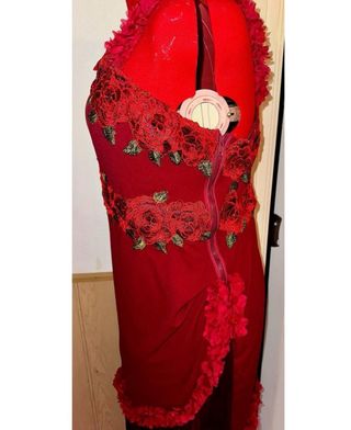 Vestido granate biselado con final en fleco y apliques de flores y detalles en strass. Hecho a mano, ideal para algun espectaculo o evento especial. Talla 50/52 Medidas: Largo 142 cm Pecho 109 cm Cintura 100 cm Caderas 125 cm Lleva cremallera lateral y la tela es semi elastica *Precio algo negociable*