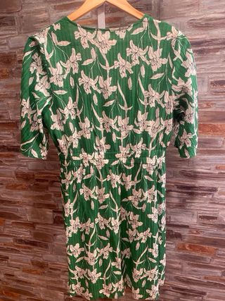 Precioso vestido de la marca Mango. Es de color verde con estampado floral. - Talla: S - Manga: tres corte - Escote: pico
