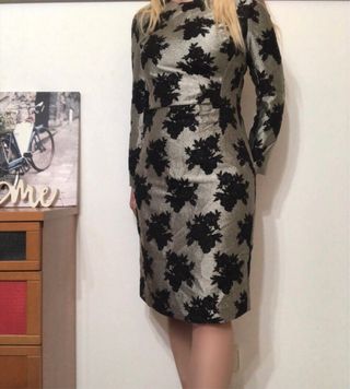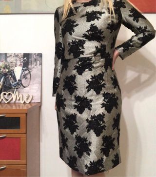 Vestido fiesta o ceremonia Carolina Herrera midi, color plateado de manga larga y cuello redondo con bordados de flores en color negro, fruncido en un lado, corte midi. Cierre con cremallera invisible en la parte trasera, y forro interior. Talla 38/40. Composicion 57% Acrilico 40% Poliester 3% Poliamida. Muy pocos usos. Tiene 2 o 3 hilos sueltos (ultima foto) Medidas Hombros 38 cm Sisa a sisa 46 cm Cintura 40 cm Manga 51 cm Cadera 50 cm Largo 98 cm