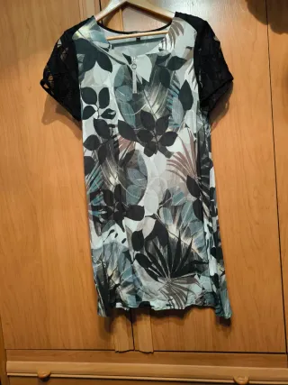 Vestido con un llamativo estampado de hojas y flores, perfecto para un look casual. Talla 48-50 - Diseño con manga corta de encaje negro. - Cremallera frontal plateada en el escote. - Tejido ligero y fluido.