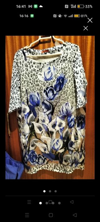 No envío por la aplicación solo por correos ordinario o certificado Precioso vestido de manga corta con un estampado combinado de flores azules y blancas sobre un fondo con estampado de leopardo en tonos grises. Es una prenda única y elegante, ideal para cualquier ocasión. - Diseño original y favorecedor. - Estampado de flores azules y blancas. - Estampado de leopardo en tonos grises. - Manga corta.