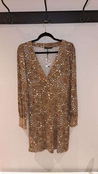 Vestido corto con un bonito estampado floral. - Diseño Naf Naf. Sin estrenar, con la etiqueta puesta. - Tonos naranjas y rosas, con un brillo muy especial y delicado. - Con forro. - Manga francesa. Repuesto para los botones de la manga. - Talla 36, pero naf naf talla bastante grande. - Medida de la cintura al bajo: 49 cm. - Medida de la parte superior del hombro a la cintura: 38 cm. - Medida de la cintura: 84 cm. Para llevar suelto o con un cinturón si se prefiere.