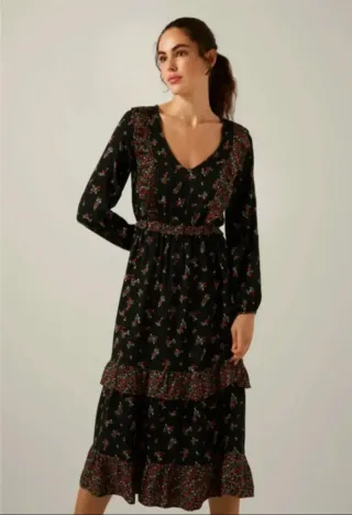Vestido largo de la marca Oysho con un estampado de pequeñas flores sobre fondo negro. Amplio, cómodo y con goma en los puños para ajustar. Perfecto estado. - Diseño de manga larga. - Corte fluido y favorecedor. - Estampado detallado en tonos variados.