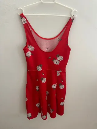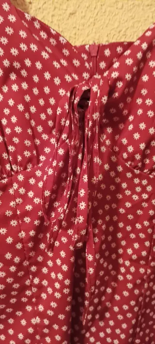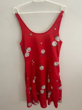 Vestido de tirantes con un estampado floral. - Diseño de tirantes. - Estampado de flores blancas sobre fondo rojo.