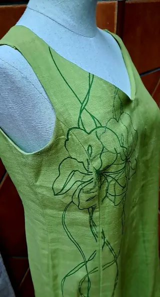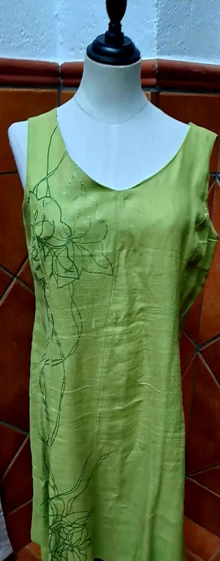 Vestido de lino con un diseño floral bordado. - Diseño sin mangas. - Escote en V. - Detalle de bordado floral en el frente. - Acabado con pequeñas pedrerías.
