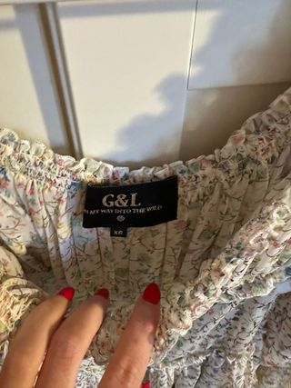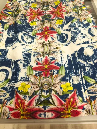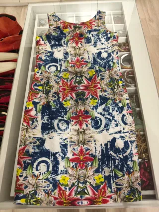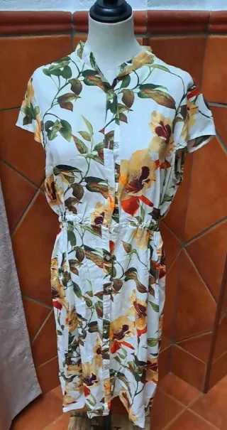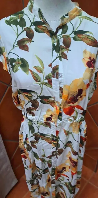 Vestido con estampado floral vibrante. - Diseño con cuello blanco. - Mangas cortas con detalle. - Cintura elástica. Da para talla s solo presenta el boton de la flor de resina roto se puede pegar con lotite o se puede conseguir otro de la marca o comprar otro similar de ahi su precio ya que me costo 197 euros. Se ha roto de estar guardado en el armario con tanta ropa