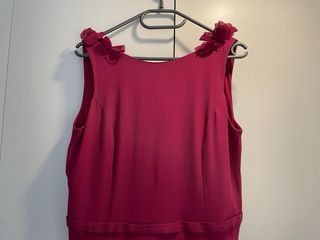 Vestido de color rojo con un diseño único en los hombros. - Talla 9-10 años - Detalle de flores en los hombros. - Corte recto. - Sin mangas.